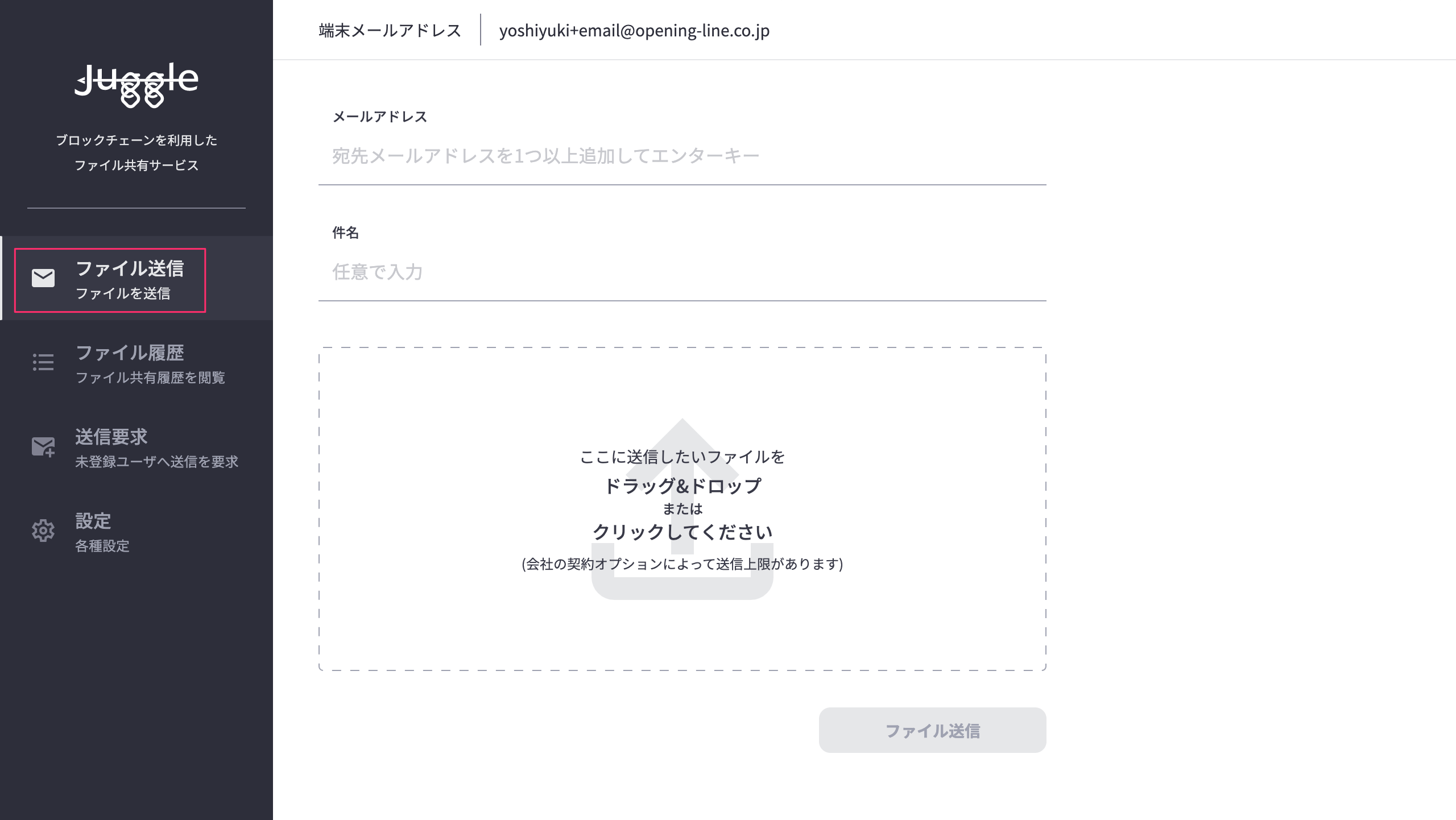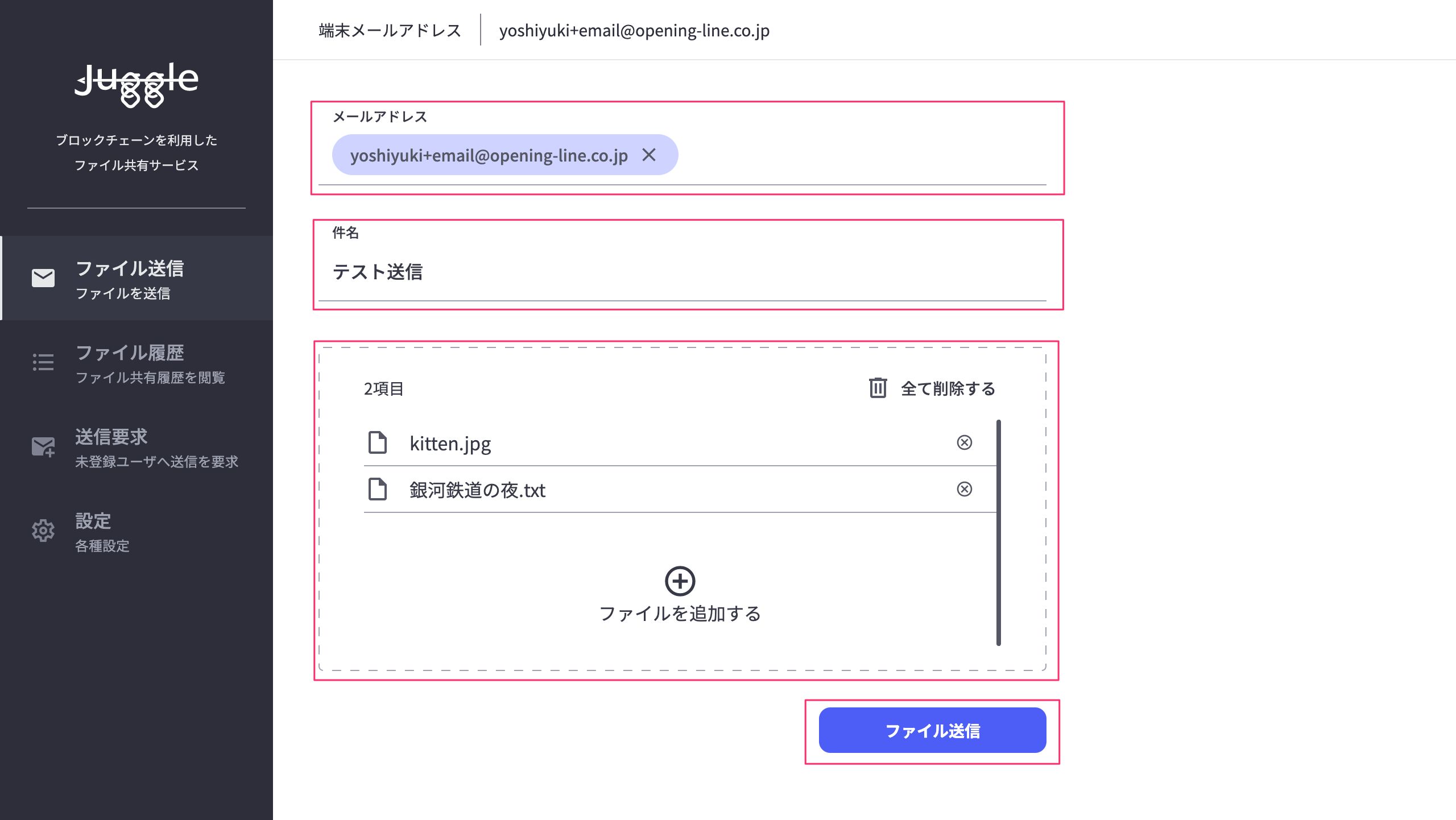 Juggleを用いて、安全に宛先へファイルを送信する機能です。