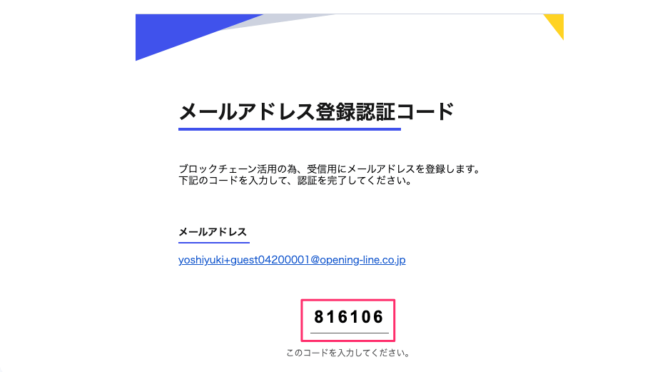 入力したメールアドレス宛に認証コードが届くので、コードを入力してください。