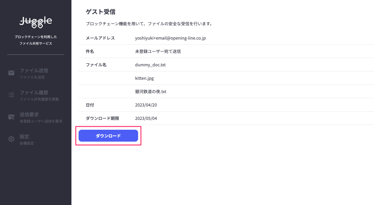 ファイル共有URLの例: https://user.juggle.jp/receive/01GYC2B61JTAFF1AZP09ZSEBES