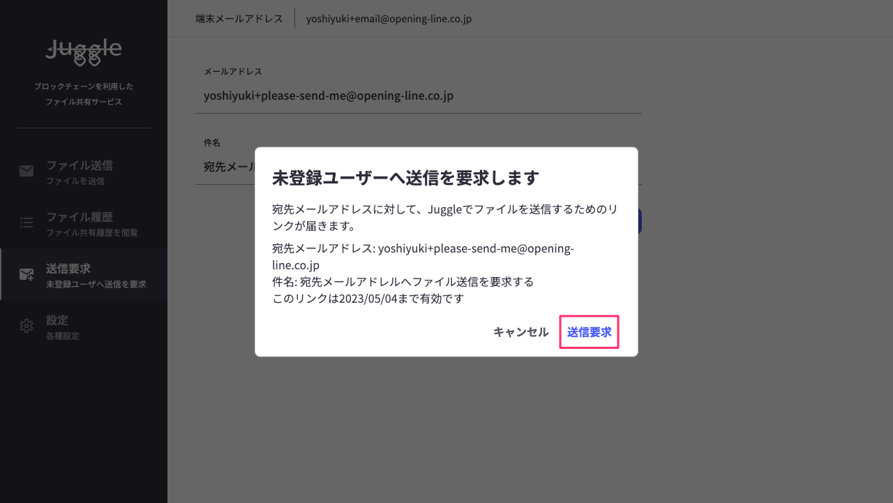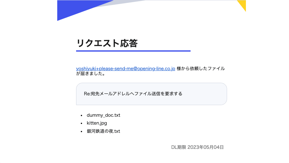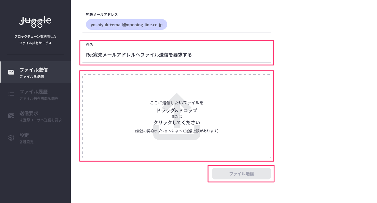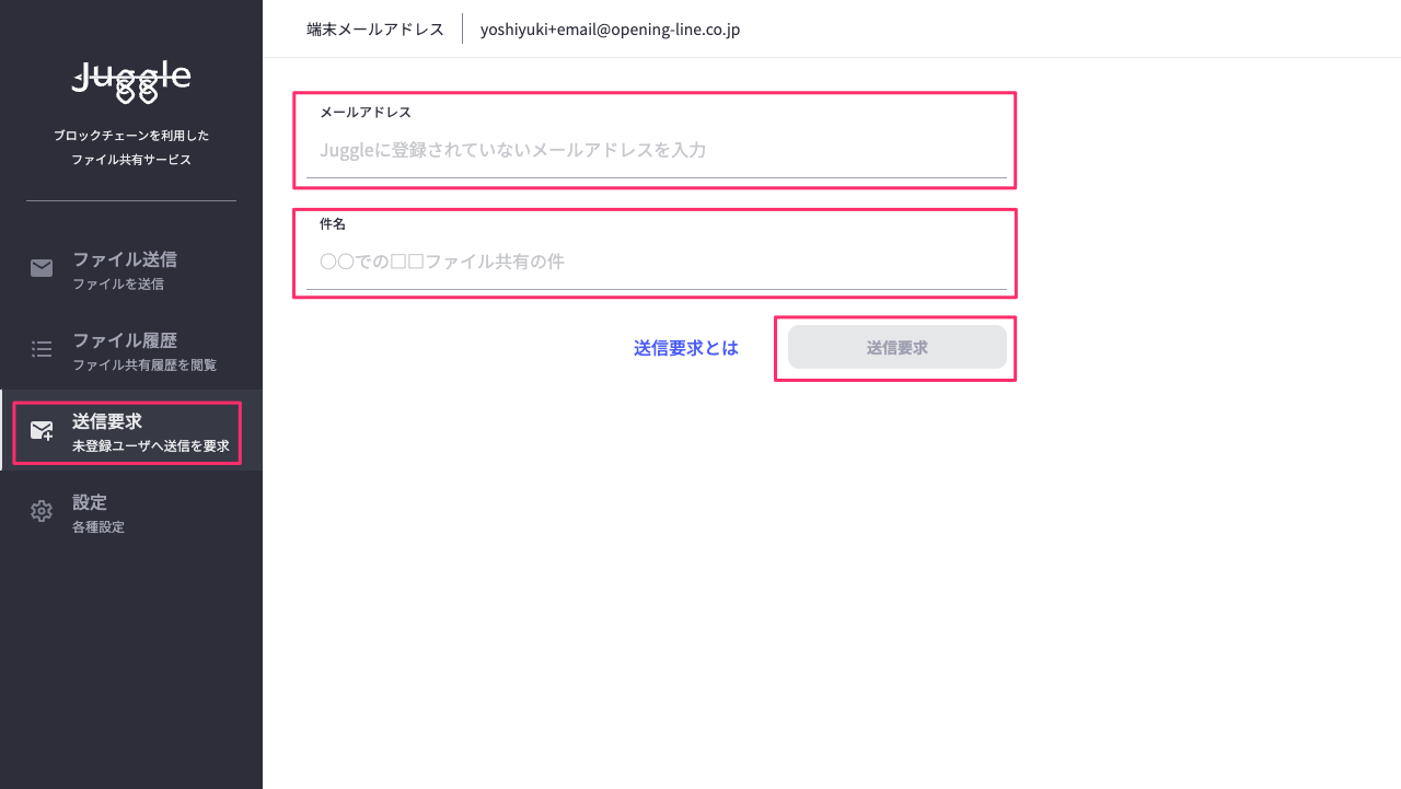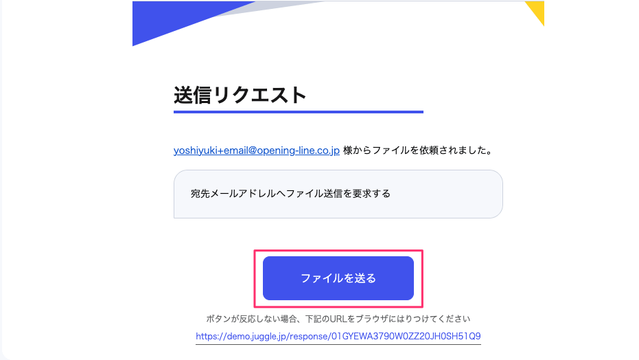 この機能は、宛先のメールアドレス所有者からファイルを送ってもらい、受け取るための機能です。