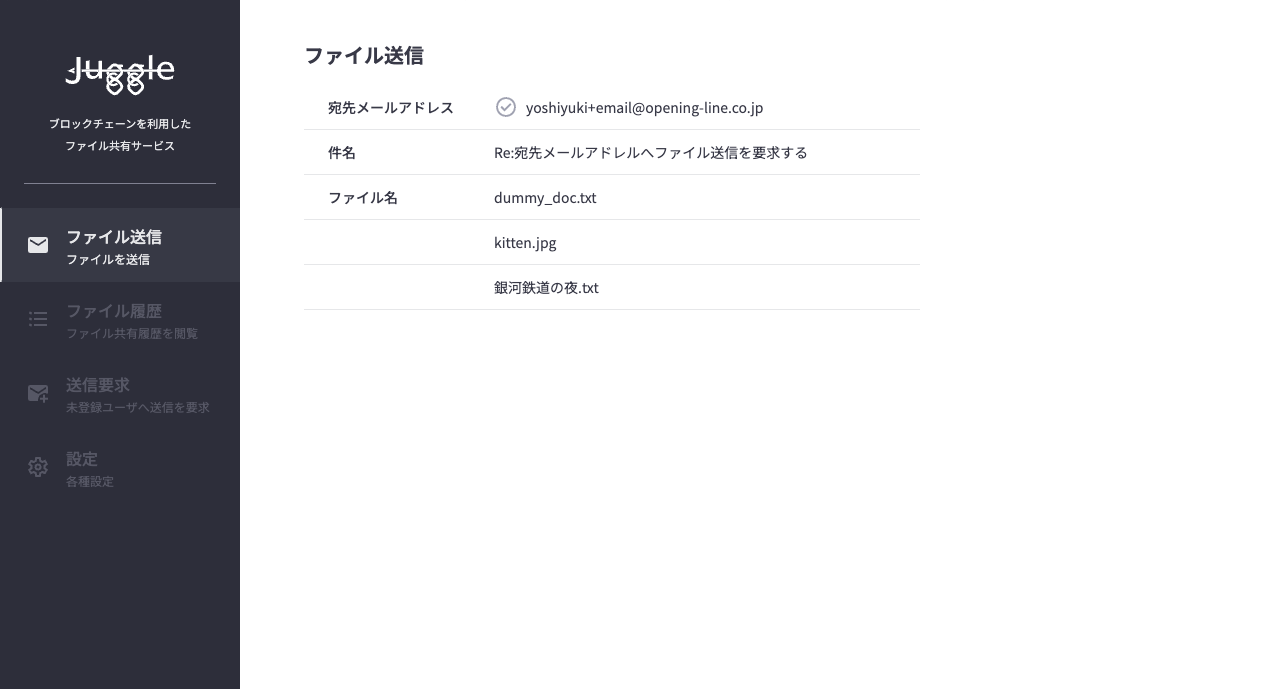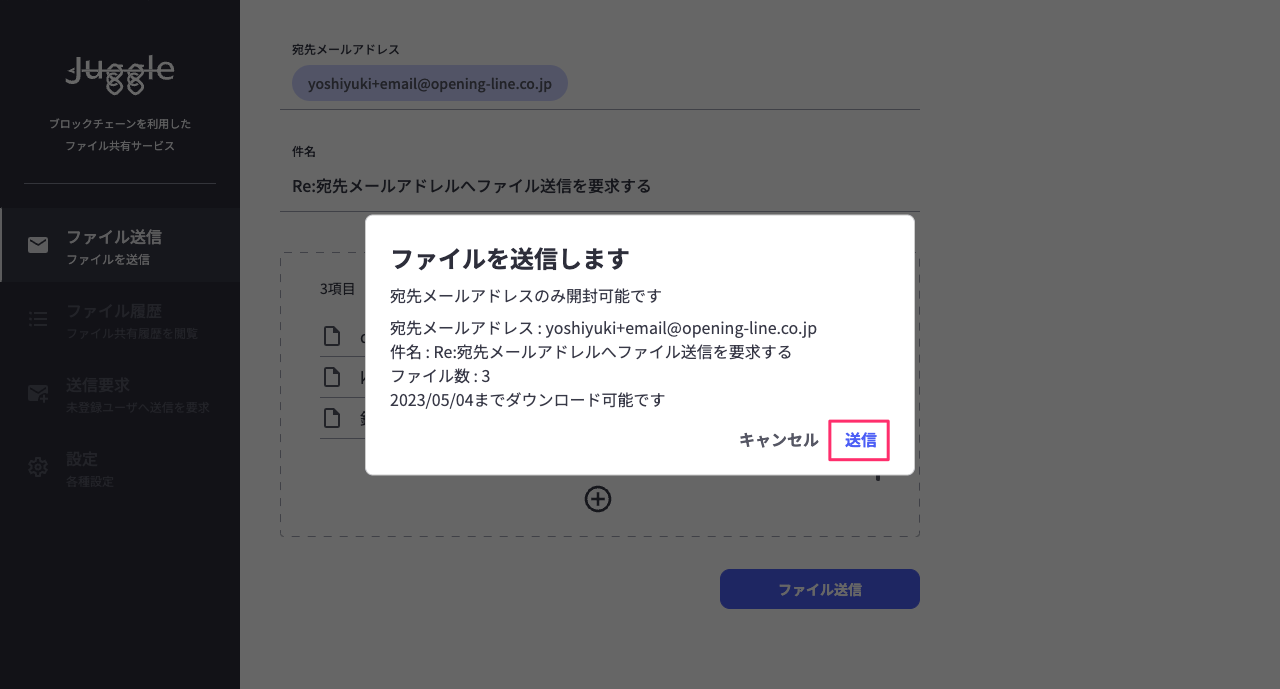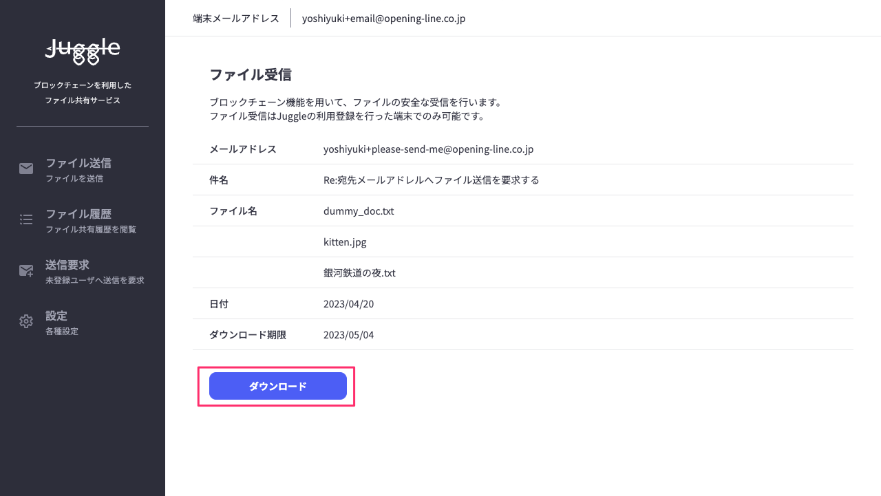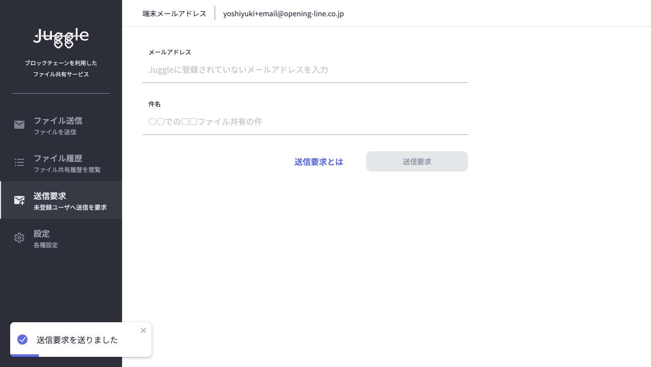 この機能は、宛先のメールアドレス所有者からファイルを送ってもらい、受け取るための機能です。