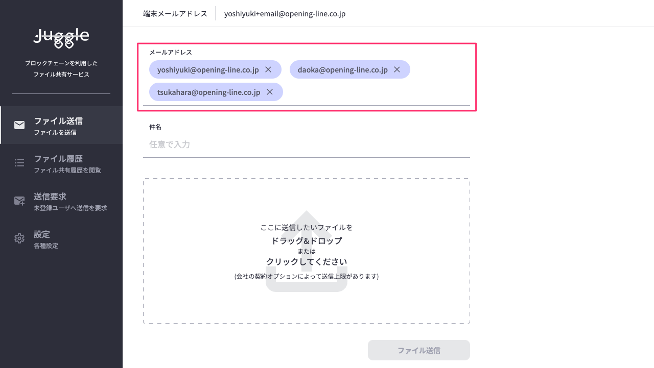 「メールアドレスを追加する」と書かれた部分にメールアドレスを入力して「エンターキー」で追加します。