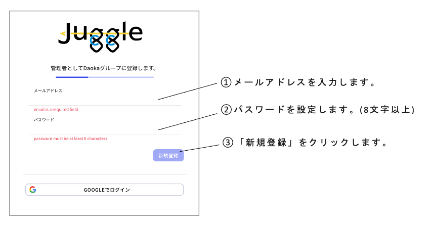 - メールアドレスで登録する際は、メールアドレス、パスワード(8文字以上の英数字を設定した複雑なもの)を設定して 新規登録 をクリックします。