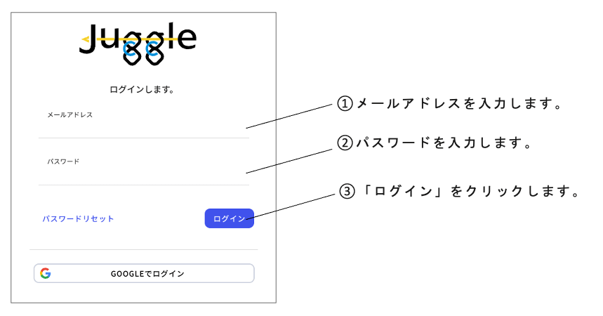 下記の図を参考に、メールアドレス、パスワードを入力して