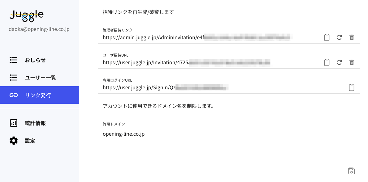 ユーザー招待のリンクの発行は管理者メニューのリンク発行からアクセスしてください。